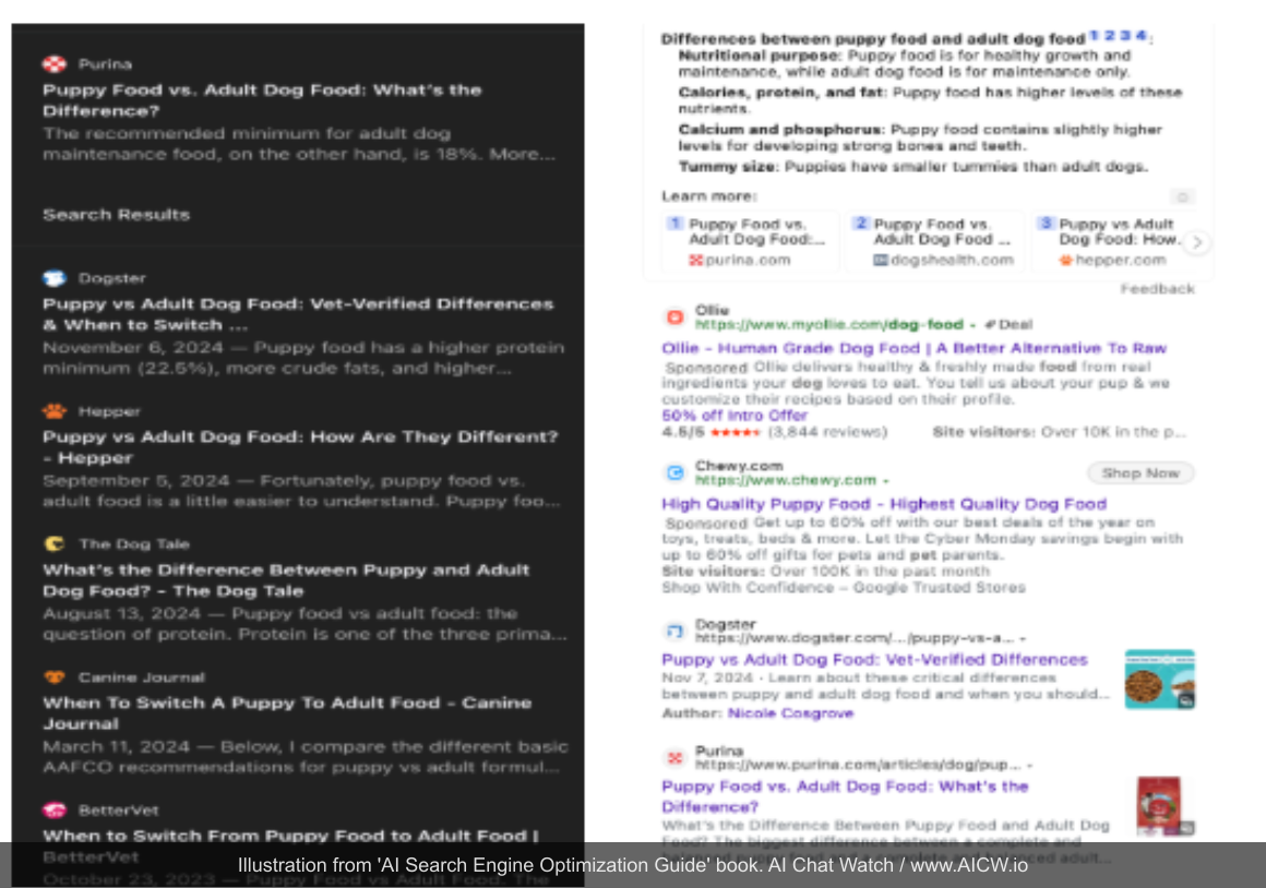 On this step, AI summarizes search results and generates a final answer with links to sources, often prioritizing more authoritative sources. AI summarization mirrors human behavior: if searching for information on puppy food, you might trust and check a few well-known veterinary sites and major brand websites first, rather than clicking through dozens of search results! At the same time the summarization also depends on the specific LLM model because every model is trained on different datasets (more about it later). Final response to a user is the summary with inline clickable references to source websites: