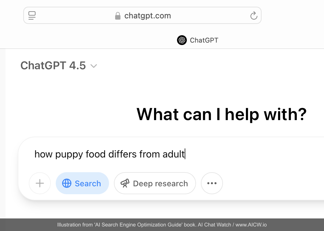 Instead of just searching for that exact phrase, the AI’s pre-processing step rewrites the query as “Research the difference between adult dog food and puppy food” and then intelligently breaks it down into three distinct, more targeted web searches: