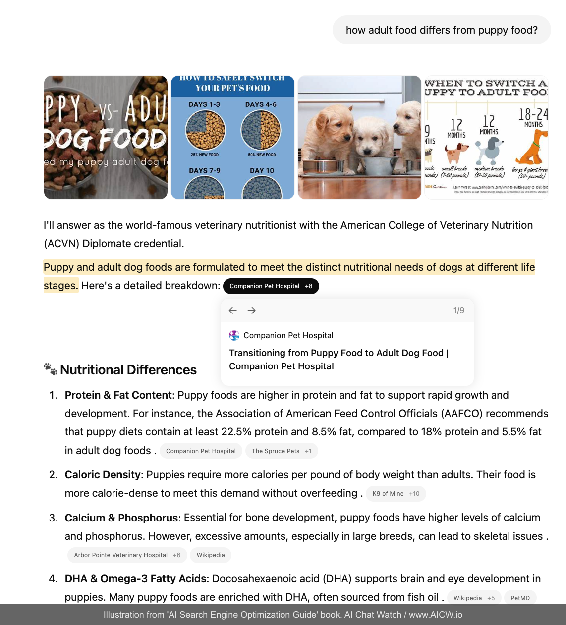 On this step, AI summarizes search results and generates a final answer with links to sources, often prioritizing more authoritative sources. AI summarization mirrors human behavior: if searching for information on puppy food, you might trust and check a few well-known veterinary sites and major brand websites first, rather than clicking through dozens of search results! At the same time the summarization also depends on the specific LLM model because every model is trained on different datasets (more about it later). Final response to a user is the summary with inline clickable references to source websites: